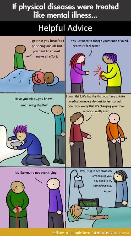 The perception of illness varies greatly from person to person. One individual may be very empathic and caring, whereas another may engage in tough love. This variation is based on our perceptions and experiences in life. Very little can completely change our perception, as we always find a natural way to revert back to it. In terms of physical health our perception is very accepting, a sense of urgency, in terms of receiving treatment and ensuring the care needed is received. This also translates to mental health, but there is a difference.
